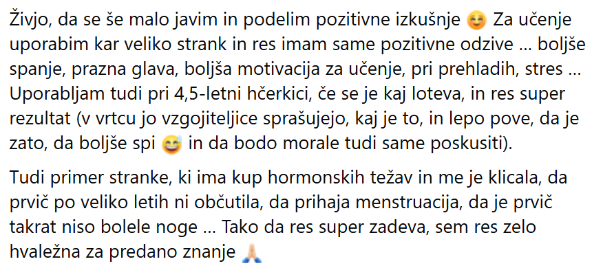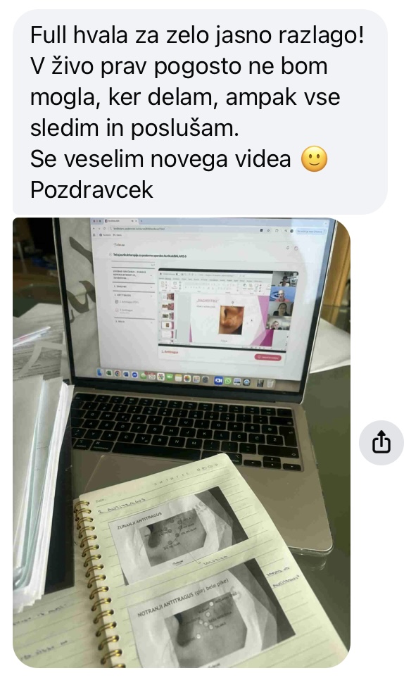 “Tečaj aurikuloterapije je zahtevnejši kot sem si mislila. Nujno je redno delo in učenje. Vendar, vse skupaj nam je Alja bistveno olajšala z načinom podajanja snovi. Res je odlična predavateljica! Predava jasno, strukturirano, preprosto. Investicija v znanje na področju aurikuloterapije je sigurno ena boljših odločitev, predvsem ker je metoda hitra in učinkovita. 😊 Skratka, tečaj je presegel vsa moja pričakovanja! 😊“